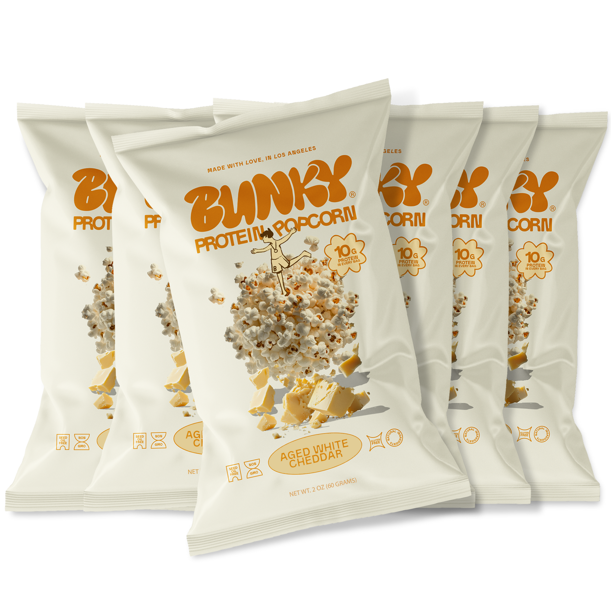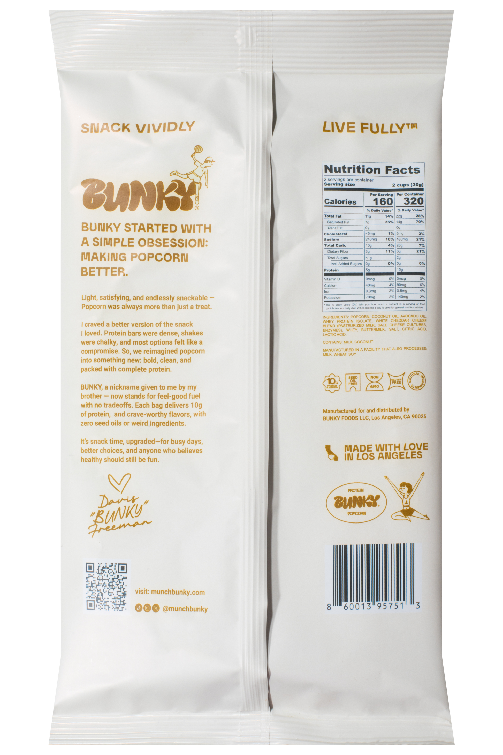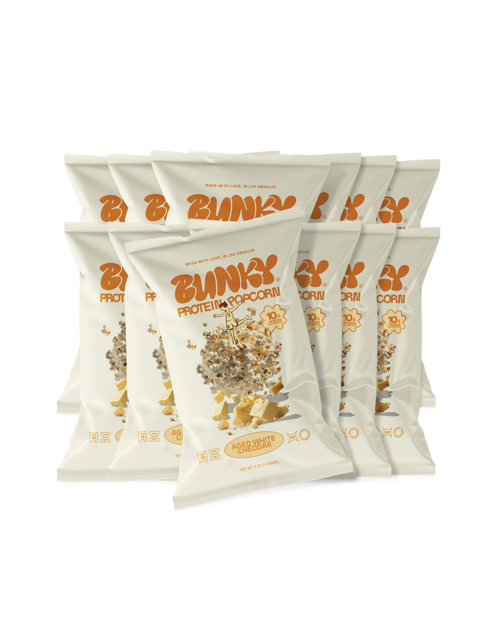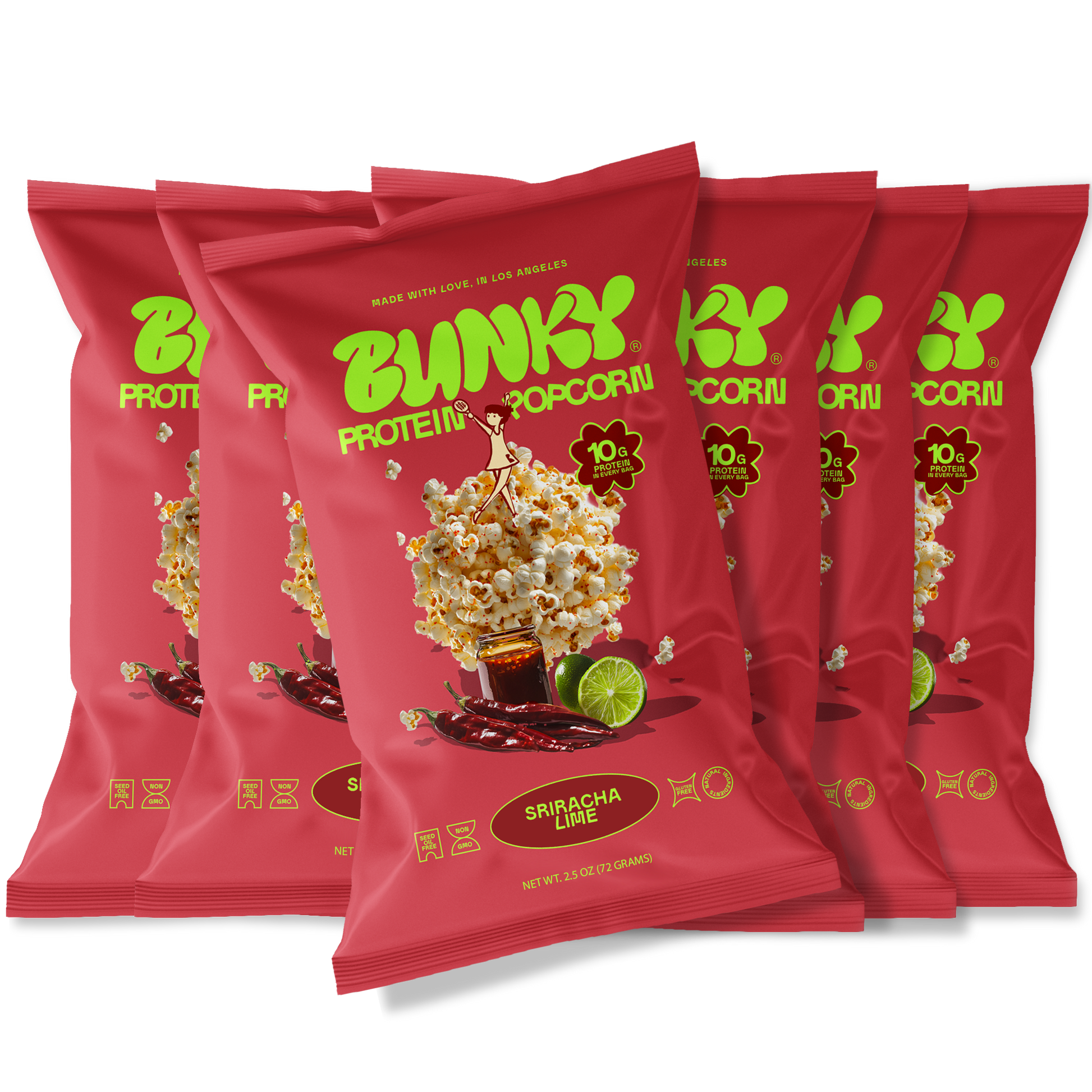 Discover the protein -packed punch of Bunky Popcorn. Air-popped to perfection and bursting with bold flavor, our small batch made popcorn delivers satisfaction in every bite. Made with premium ingredients like whey protein isolate and natural seasonings, each 2 and 2.5oz bag (60/72g) is a smart, crave-worthy snack that’s a good source of fiber and lower in calories than traditional popcorn. Whether you’re refueling after a workout or just craving something bold and better-for-you, choose Aged White Cheddar or Sriracha Lime varieties for flavor and function—all in one craveable bag. Available in 3, 6 or 12 pack quantities.