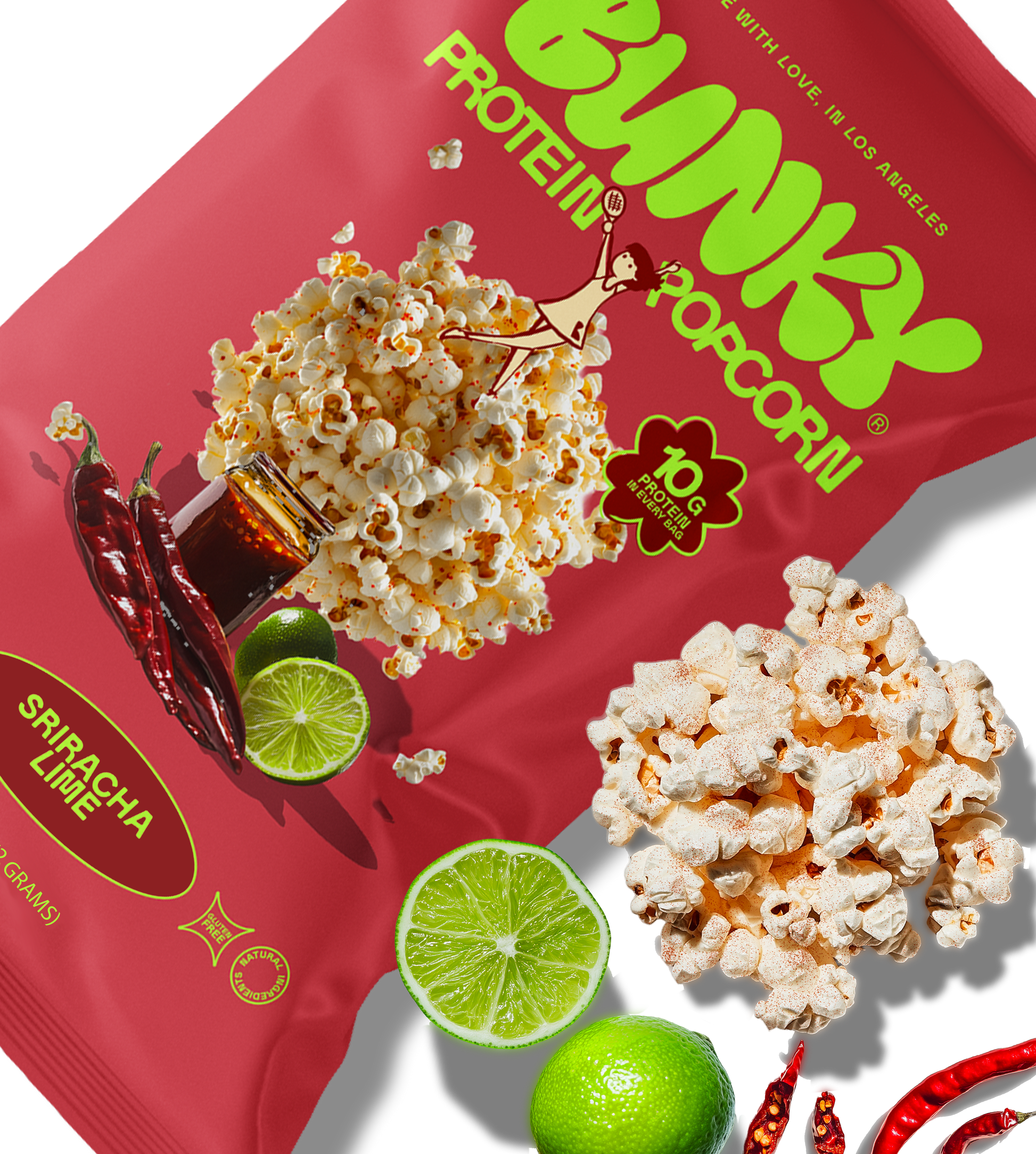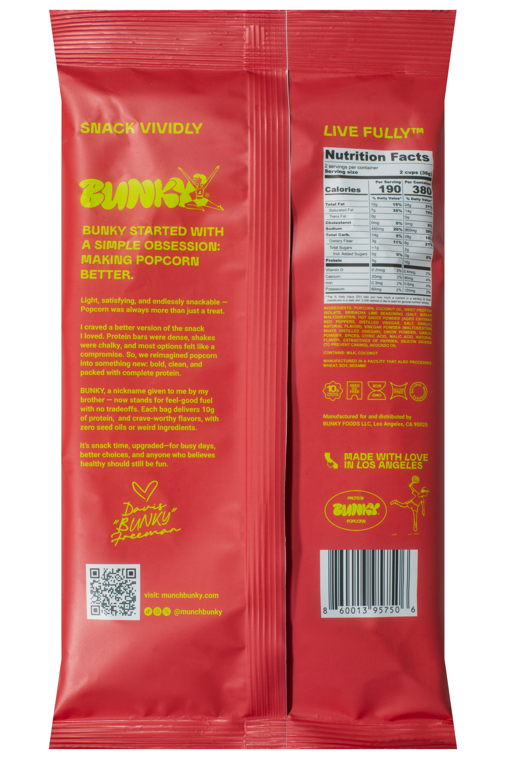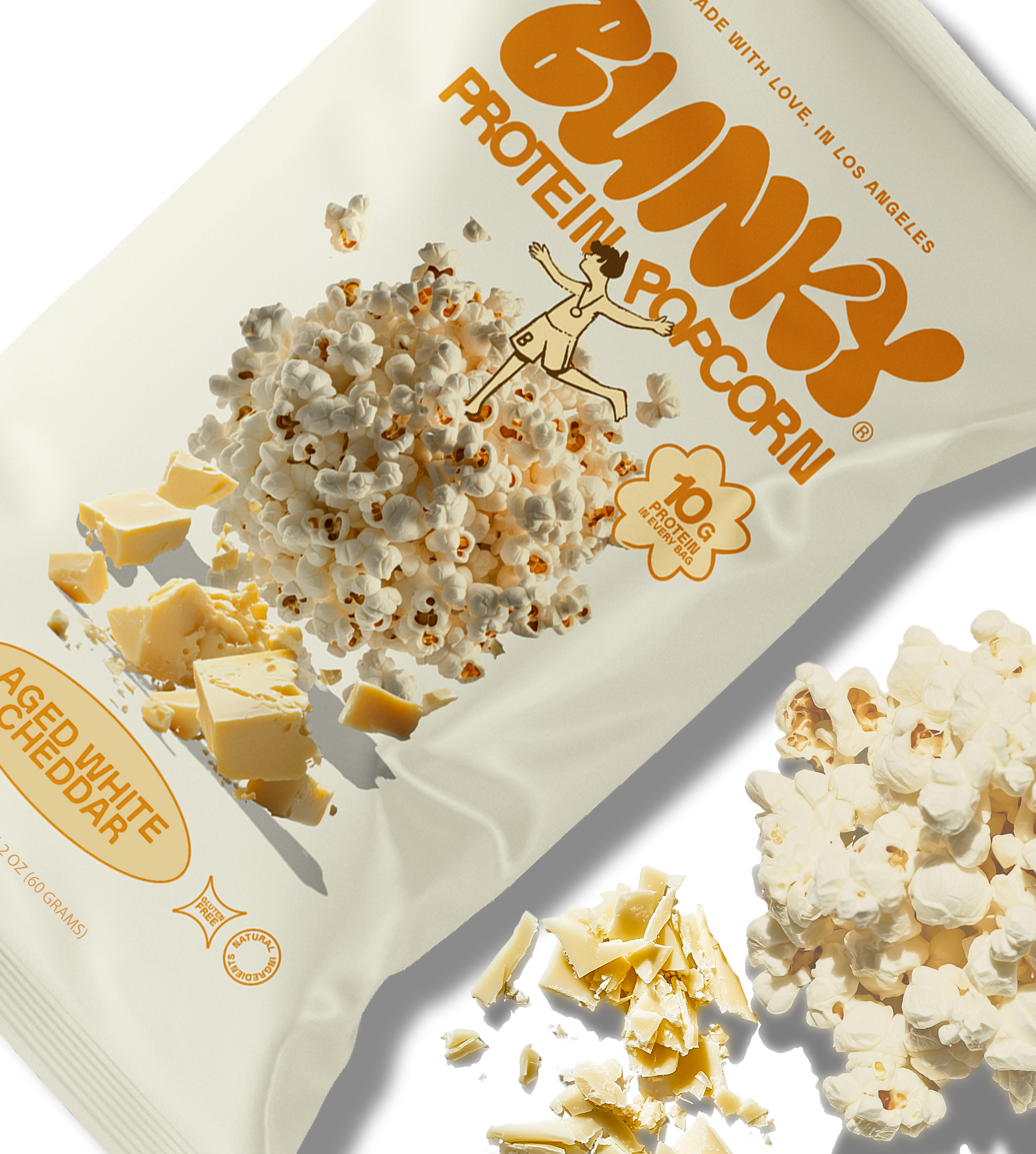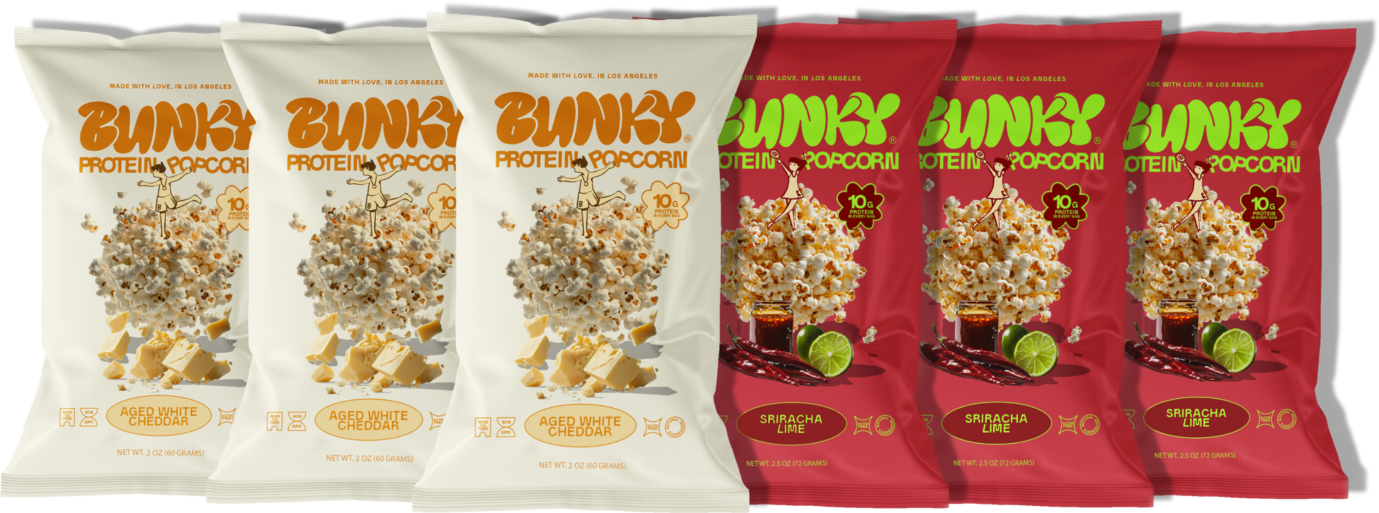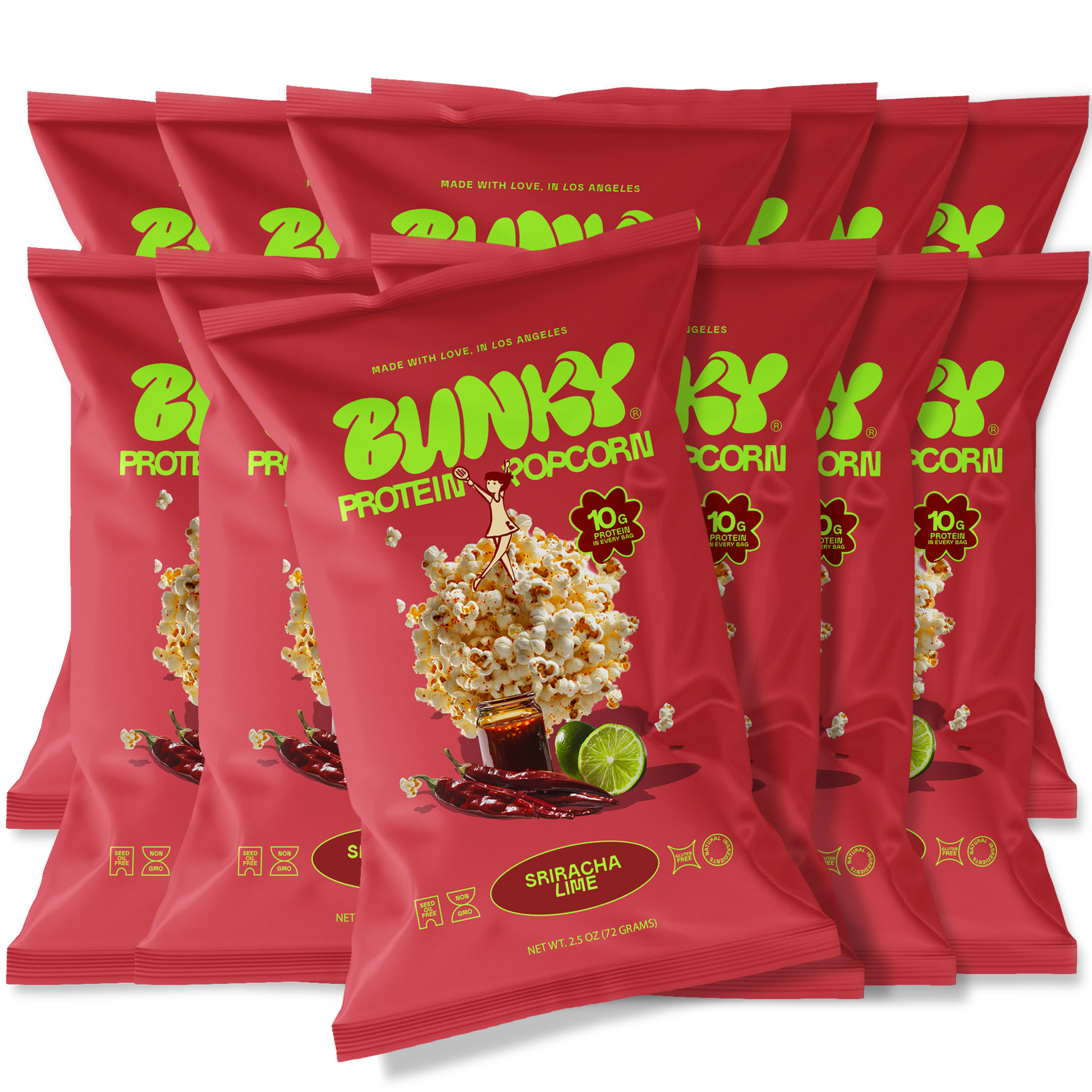 Discover the protein -packed punch of Bunky Popcorn. Air-popped to perfection and bursting with bold flavor, our small batch made popcorn delivers satisfaction in every bite. Made with premium ingredients like whey protein isolate and natural seasonings, each 2 and 2.5oz bag (60/72g) is a smart, crave-worthy snack that’s a good source of fiber and lower in calories than traditional popcorn. Whether you’re refueling after a workout or just craving something bold and better-for-you, choose Aged White Cheddar or Sriracha Lime varieties for flavor and function—all in one craveable bag. Available in 3, 6 or 12 pack quantities.